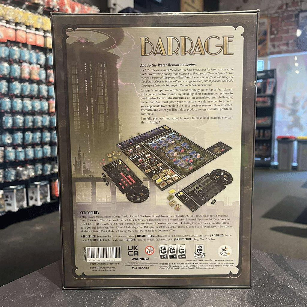 Barrage is a resource management strategic game in which players compete to build their majestic dams, raise them to increase their storing capacity, and deliver all the potential power through pressure tunnels connected to the energy turbines of their powerhouses.