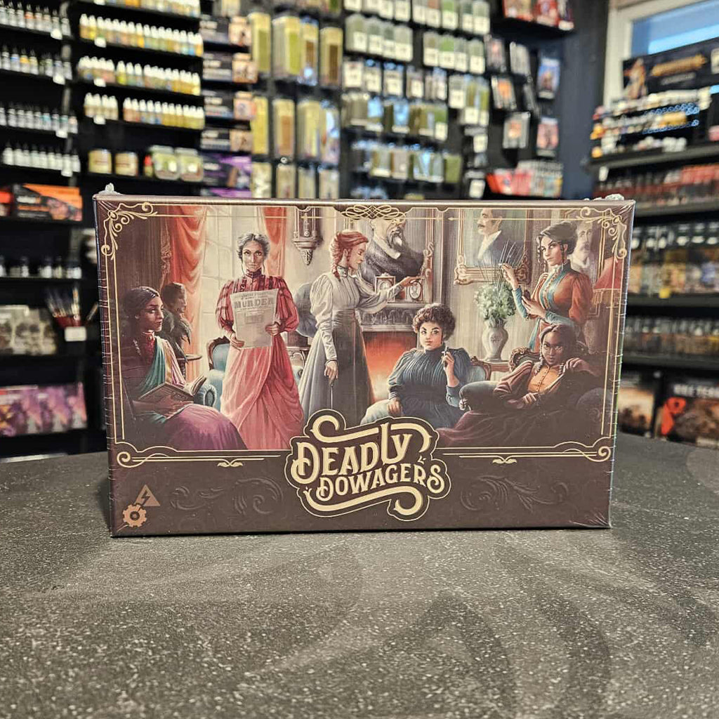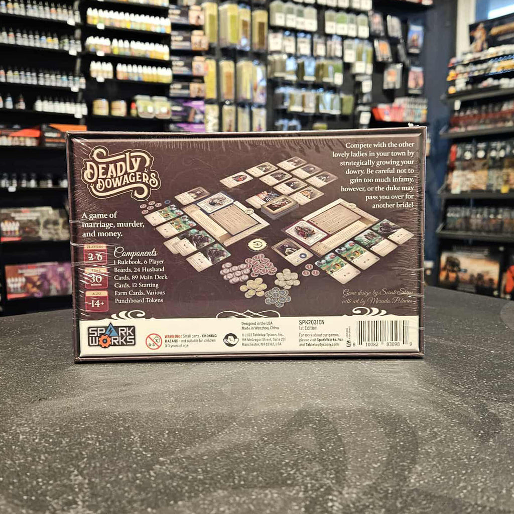 Deadly Dowagers is a game of marriage, murder, and money. You compete with the other lovely ladies in your town by strategically growing your dowry, while being careful not to gain too much infamy, or the duke may pass you over for another bride!