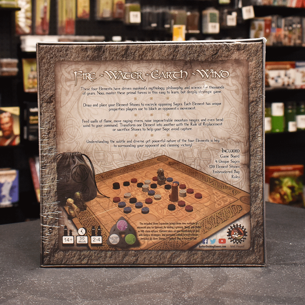 Players take yours drawing and placing up to four Element Stones to encircle opposing Sages. Each Element has unique properties players use to to block an opponent’s movement.