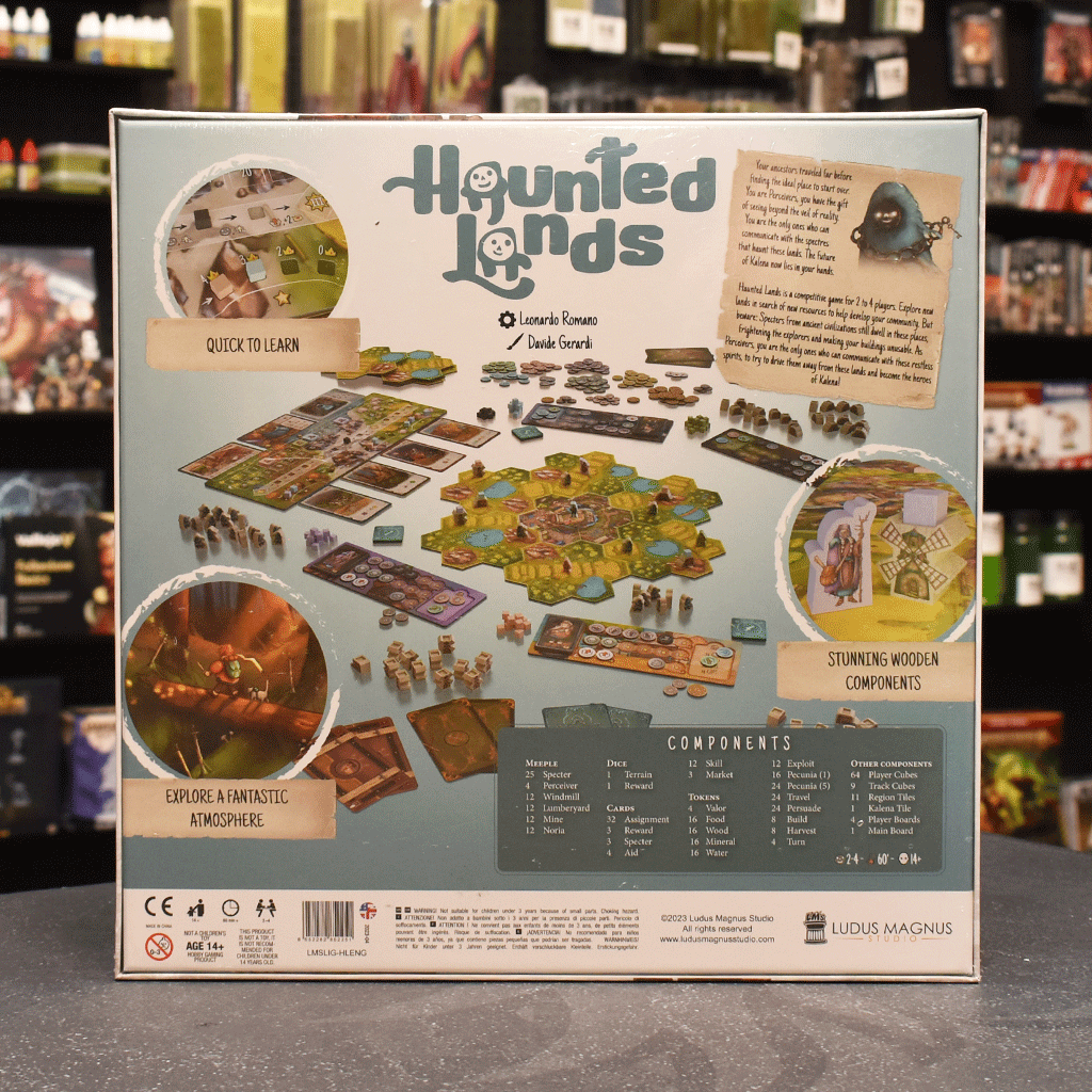 Haunted Lands is a competitive Euro-game for 2-4 players, with beautiful illustrations and amazing meeples. Explore new lands in search of new resources to help develop your community. But beware: Specters from ancient civilizations still dwell in these places, frightening the explorers and making your buildings unusable. As Perceivers, you are the only ones who can communicate with these restless spirits, to try to drive them away from these lands and become the heroes of Kalena!