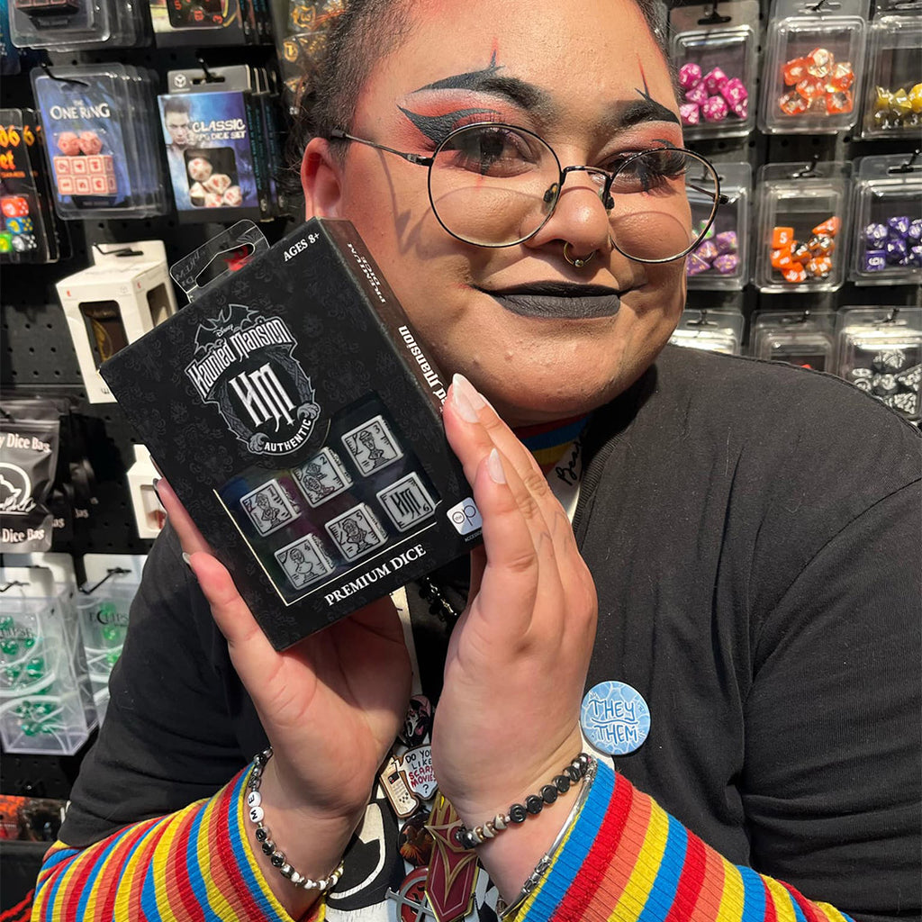 Take a handful of the “999 happy haunts” to your next game night with the Disney Haunted Mansion Premium Dice Set! This engraved, stony gray 6-sided dice set features the iconic singing busts and symbols from the classic theme park attraction stored in a collectible wallpaper-patterned tin carrying case.